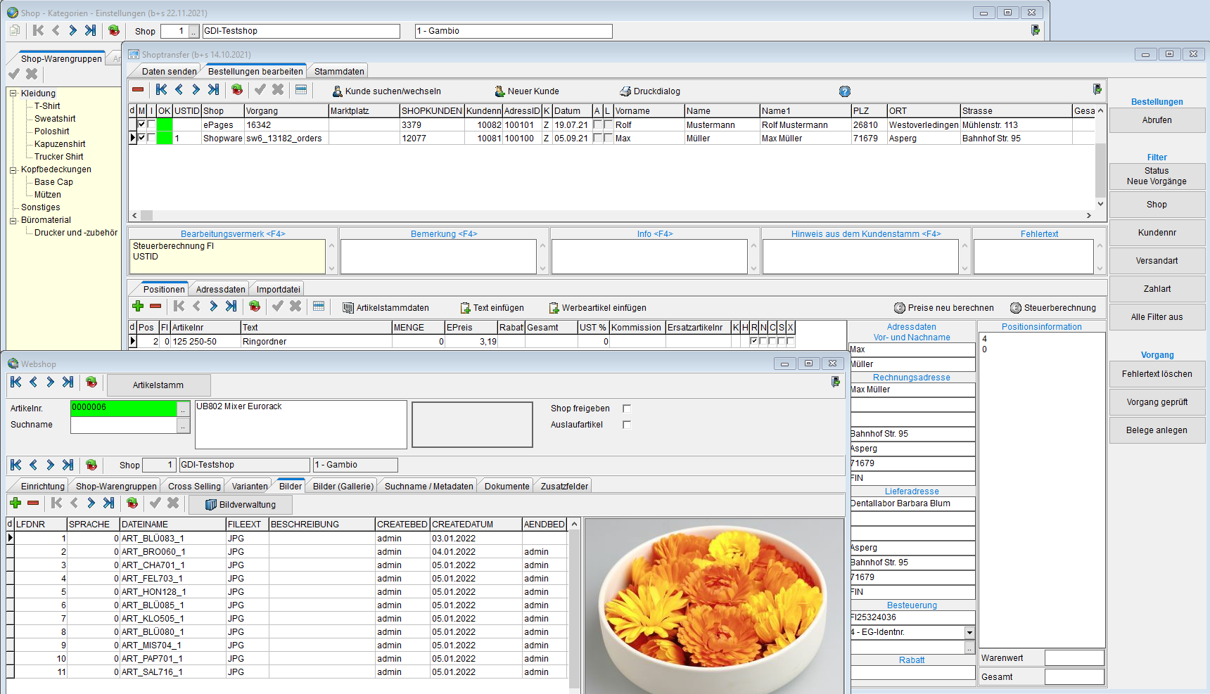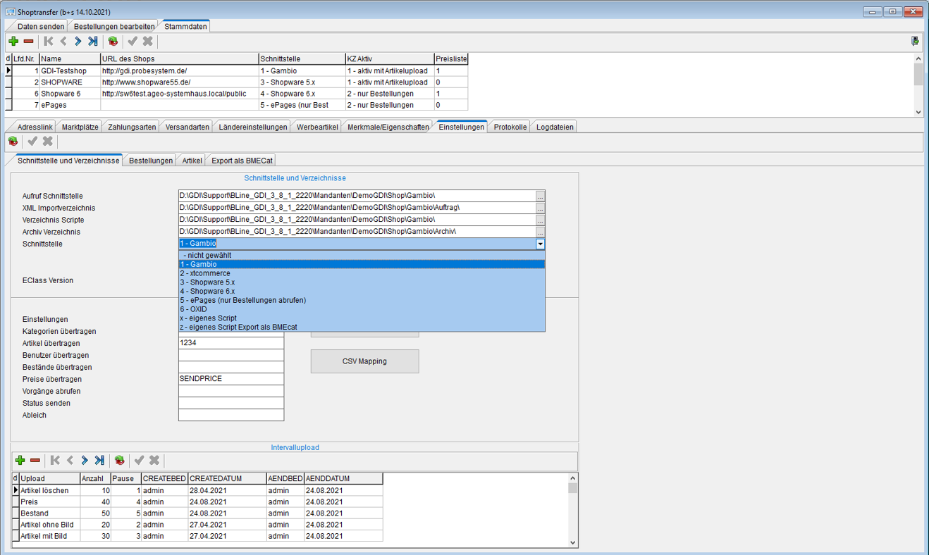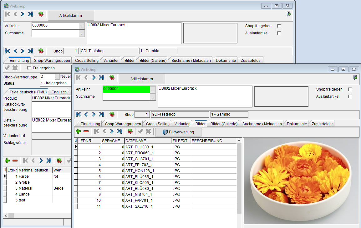 Für die Anbindung der Shops ist GDI das führende System. Hier werden die Shopkategorien, Artikeldaten- und bilder sowie die Preis und Bestände gepflegt. Über Schnittstellen werden diese Daten an die Shops übertragen.