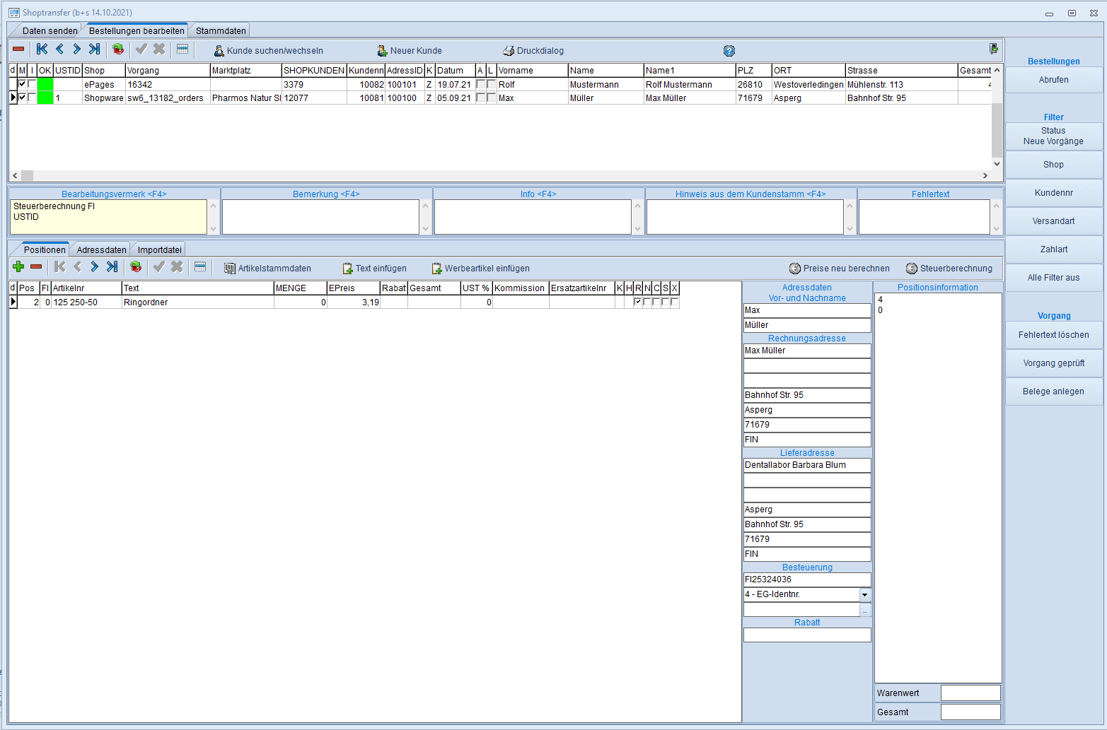 - Wird der Besteller nicht gefunden kann der Bediener manuell eine Kundennummer zuweisen oder einen Neukundenanlegen.