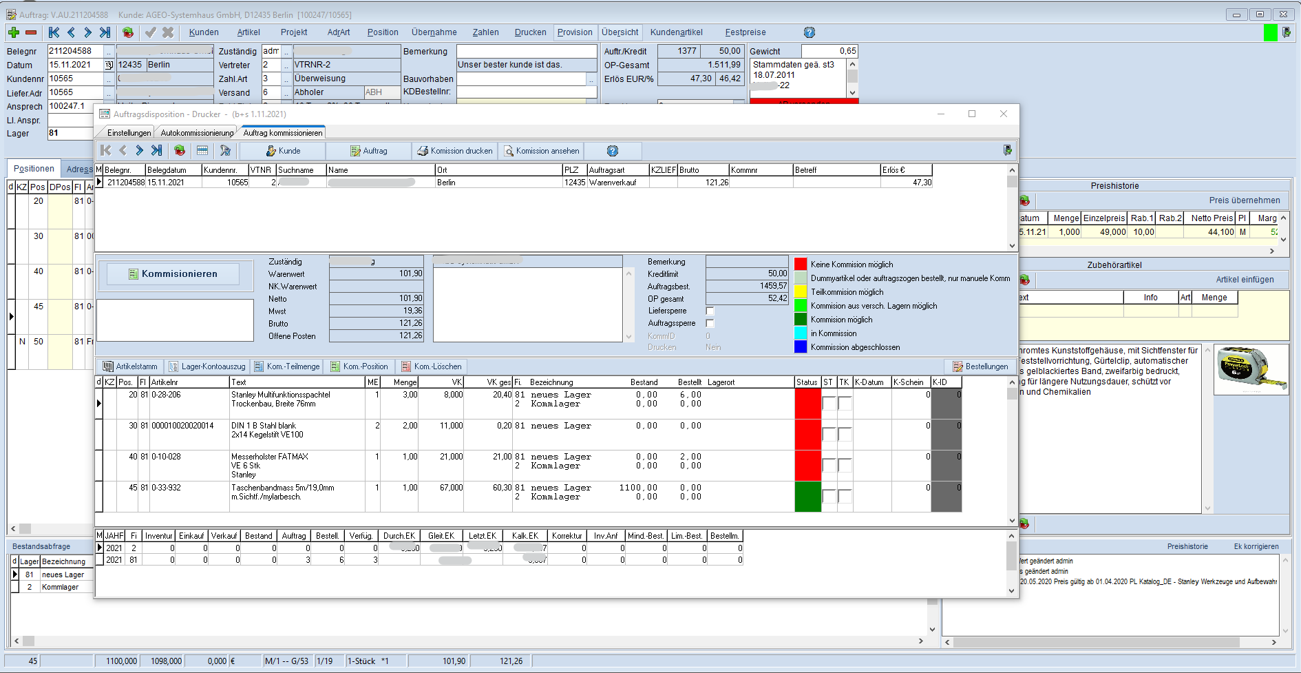 Für die Abwicklung der Aufträge müssen die am Lager verfügbaren Artikel den Aufträgen zugeordnet werden. Da nicht für alle Aufträge sichergestellt werden kann, dass die Artikel zu 100% verfügbar sind, müssen die am Lager befindlichen Artikel kommissioniert werden.