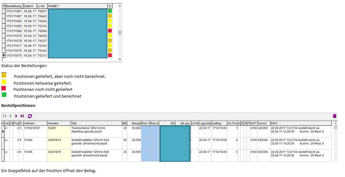 Die Bestellübersicht listet alle Bestellungen der Lieferanten im Zeitraum der 12 Monate mit dem Status Ihrer Bearbeitung auf.