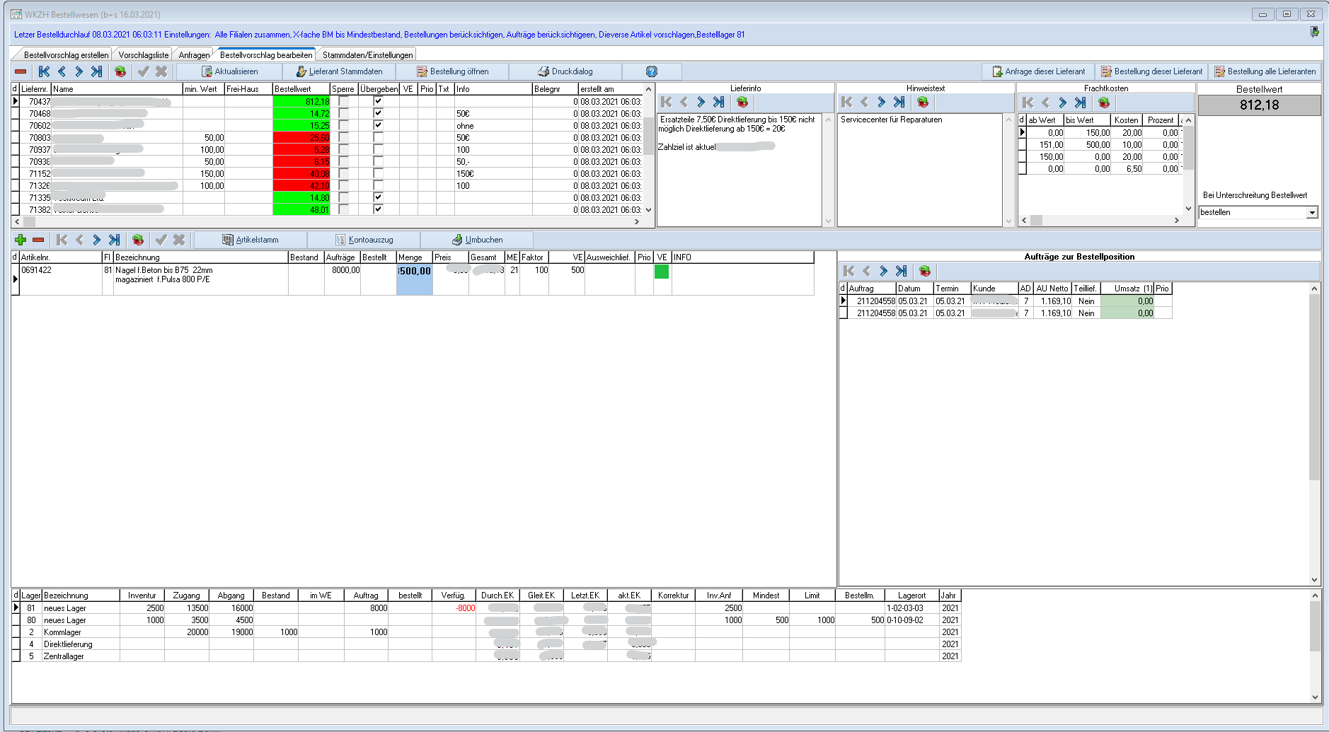 Vorschlag zur Auffüllung des Lagers unter Berücksichtigung von Mindest- und Limitbestand, laufender Bestellungen und Aufträge. Berücksichtung von Mindesbestellwert und Frachtfreigrenze.