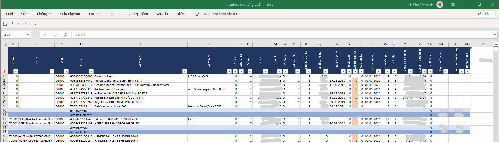 Zur Vereinfachung der Inventurbewertung werden die Daten der aktuellen Inventurtabelle erweitert um Informationen zur letzten Inventur und dem letzten Einkauf, sowie den in den Artikelstammdaten hinterlegter Feldern zur Kennzeichnung als Altartikel, dem Inventurbewertungsfaktor und der Inventurklasse, in eine CSV für die Bearbeitung in Excel ausgelagert.