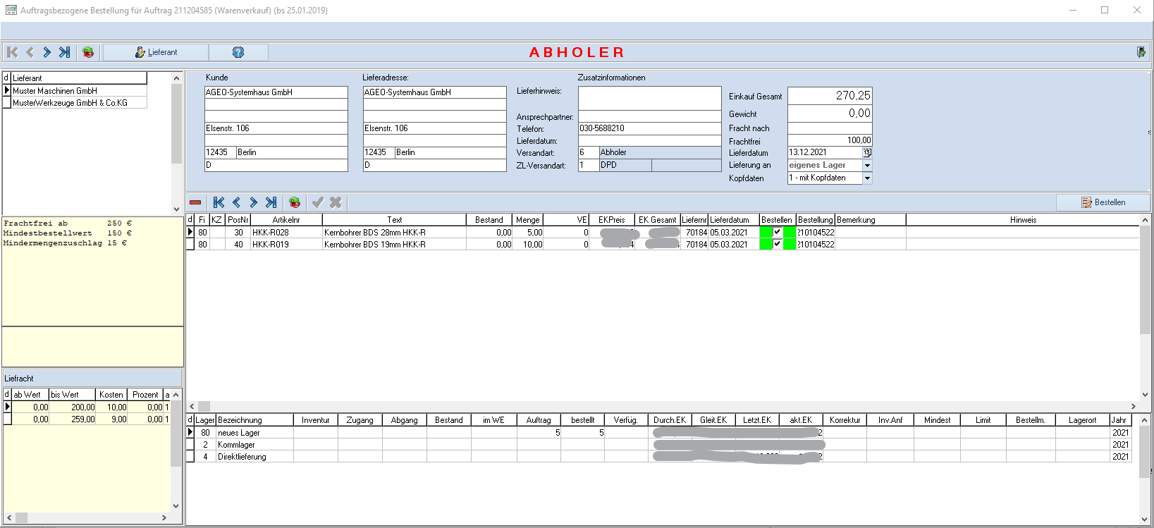 Die in der Auftragserfassung per Mausklick gestartete Maske für die auftragsbezogene Bestellung stellt für jeden in den Belegpositionen hinterlegten Lieferanten die entsprechenden Auftragspositionen tabellarisch dar. Zu den einzelnen Lieferanten werden die wichtigsten Eckdaten für das Bestellwesen angezeigt.