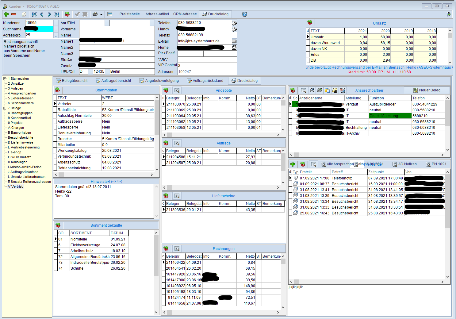 - Komponenten zur Vertriebssteuerung; AD Mitarbeiter u.a. mit Filterfunktion zur Anzeige nur der eigenen Kundenadressen, Belege und Umsätze, spezielle Auswertungen wie Tagesstatistik, Provisionsübersicht etc