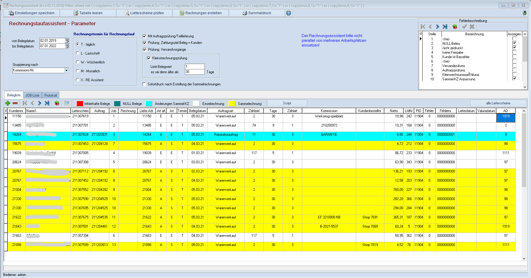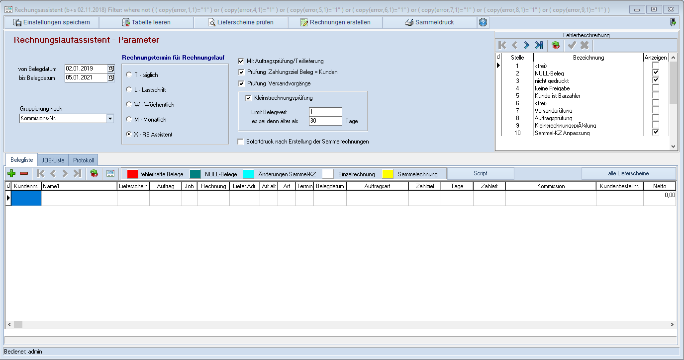 Der Rechnungsassistent kann sowohl im Dialog als auch zeitgesteuert im Hintergrund eingesetzt werden. Entsprechend der hinterlegten Regeln werden Lieferscheine als Einzelrechnungen (wie. z.B. Mietrechnungen oder Reparaturrechnungen) oder als Sammelrechnungen (z.B. gruppiert durch Bauvorhaben oder Kommissionen) übernommen und ausgedruckt.