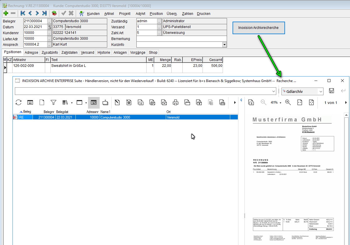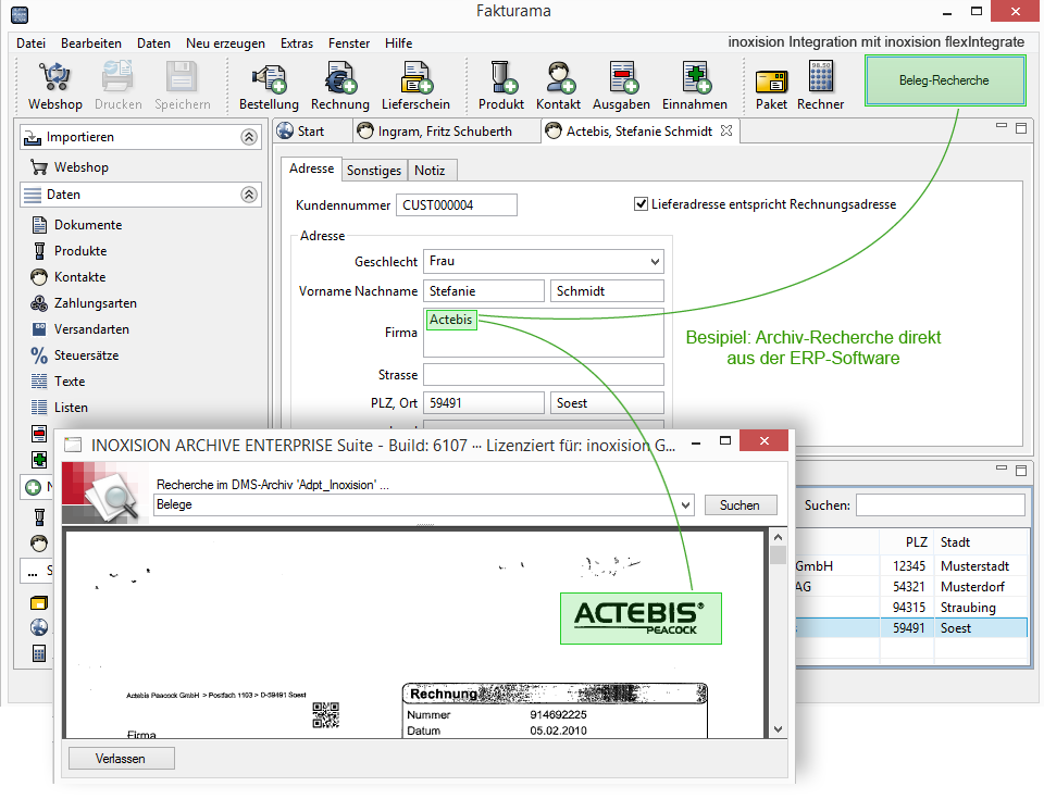 Mit einer Integration wird es für den Anwender zum Beispiel möglich, mit einem einzigen Klick alle archivierten Dokumente zu einem in seinem Warenwirtschaftssystem angelegten Kunden einzusehen.