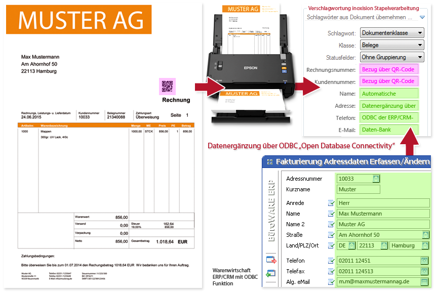 Beispiel: Sie scannen ein Dokument ein und erfassen nur wenig Information (Grundinformationen) - bspw. nur die Kundennummer. Die dazugehörigen fehlenden Kundeninformationen gleicht nun der inoxision Meta-Index-Server direkt über eine ODBC-Schnittstelle mit Ihrer Unternehmenssoftware ab und ergänzt alle vorhanden Daten/Informationen die vorhanden sind.