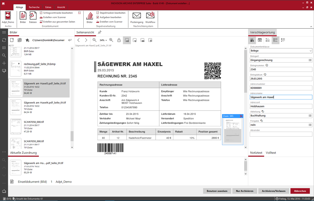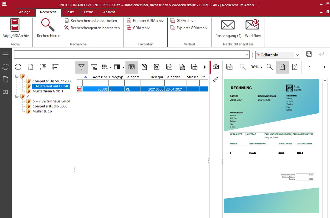 inoxisionARCHIVE steht für leichte Bedienung und Übersichtlichkeit. inoxisionARCHIVE ist sehr intuitiv und kann bereits nach kurzer Einarbeitungszeit genutzt werden. Insellösungen (verschiedene, bestehende Softwareprodukte) innerhalb eines Unternehmens werden zusammengeführt und so optimiert. Der leistungsstarke inoxision ARCHIVE Workflowserver kann intensive Dokumentenverarbeitung automatisieren. Selbst komplexe Belegabläufe können damit leicht realisiert werden. Die innovative inoxision ARCHIVE Stapelverarbeitung mit Maskenerkennung sowie der OCR-Server bieten enorme Geschwindigkeit beim Archivieren der Dokumente. Der dadurch entstehende Volltextindex ermöglicht die Dokumentensuche mit Textfragmenten.