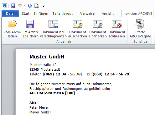 Die Integration in Microsoft® Office, welche ein Bestandteil des DMS-Moduls ist, bietet den direkten Zugriff auf Archivfunktionen direkt aus Word, Excel, Powerpoint oder Visio. Sowohl das Laden von Dokumenten direkt aus dem Archiv als auch das direkte Speichern in der entsprechenden Archivdatenbank werden unterstützt. Funktionen zur Teamarbeit wie z.B. das Aus- bzw. Einchecken von Dokumenten bieten eine ideal auf die Anforderungen im DMS-Umfeld abgestimmte Funktionalität.