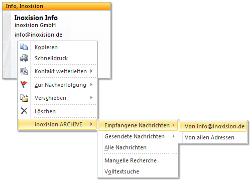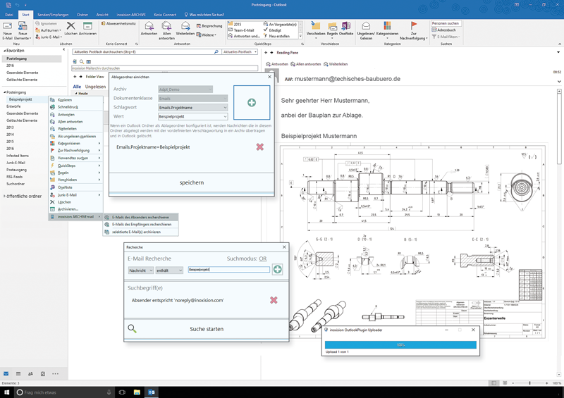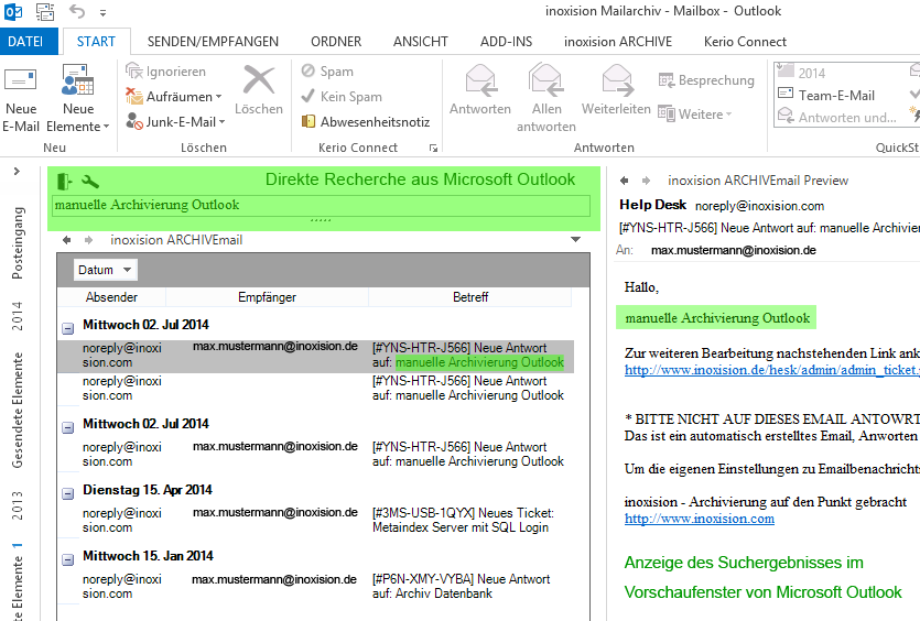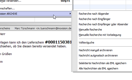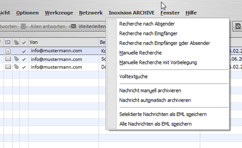 Die allgemeine Zunahme des E-Mail-Aufkommens bringt auch den Bedarf einer Archivierung der E-Mail-Nachrichten mit sich. Mit dem inoxison ARCHIVE-Modul "Mailconnect" wird der ein- und ausgehende Mailverkehr voll- oder halbautomatisch archiviert. Hierbei werden sowohl die E-Mail als auch die Mail-Anhänge mit indiziert (sofern diese in einem verwertbaren Format wie bspw. DOCX sind). Beim Recherchieren nach einer E-Mail kann sowohl nach einem Textfragment aus der eigentlichen E-Mail als auch nach einem Textfragment aus einem Mail-Anhang (Word, PDF, usw.) gesucht werden.