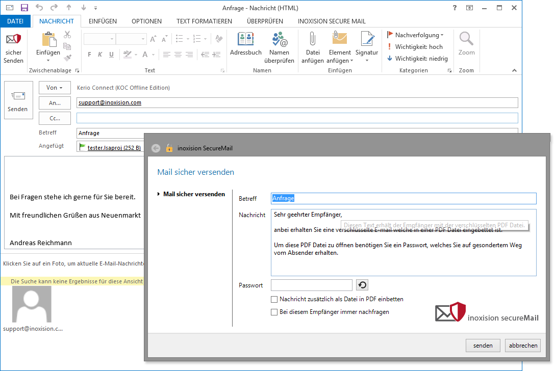 inoxision secureMail stellt Ihnen direkt in Microsoft® Outlook die Funktion „Sicher Senden“ zur Verfügung. Hierbei wird die E-Mail inkl. aller Anhänge automatisch in ein kennwortgeschütztes, 256 Bit AES-verschlüsseltes PDF konvertiert und versendet. Vorher haben Sie noch die Möglichkeit, ein manuell oder automatisch generiertes Passwort zu vergeben. Nur über dieses Passwort ist es dem Empfänger dann möglich, die Inhalte und Anlagen der E-Mail einzusehen.