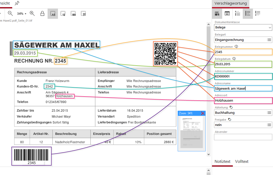 Gemeint sind hier Belege, welche originär in Ihrem Hause erstellt und darauf handschriftlich ergänzt werden, um abschließend wieder zurückzukommen. Beispielsweise können so vom Kunden unterschriebene Auftragsbestätigungen oder Lieferscheine im Stapel gesammelt und eingescannt werden. Durch einen bereits bei Erstellung aufgedruckten Barcode erfolgt die weitere Zuordnung vollautomatisch.