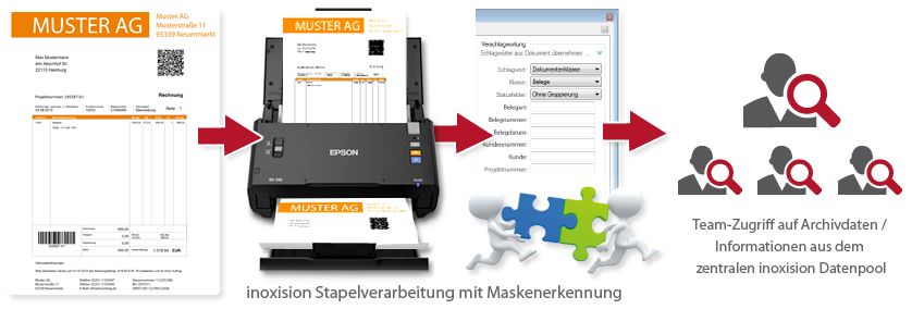 Mit dem inoxision ARCHIVE-Modul "Stapelverarbeitung" wird das Verschlagworten von wiederkehrenden, einzuscannenden Dokumenten automatisiert. Im Detail wird hier einmalig anhand einer Maske definiert, wo auf einem Beleg welches Schlagwort zu finden ist (beispielsweise wo sich auf einer Eingangsrechnung von Lieferant A die Belegnummer und das Belegdatum befinden). Um zwischen verschiedenen Masken zu unterscheiden, wird auch definiert, woran man eine Eingangsrechnung des Lieferanten A erkennen kann.