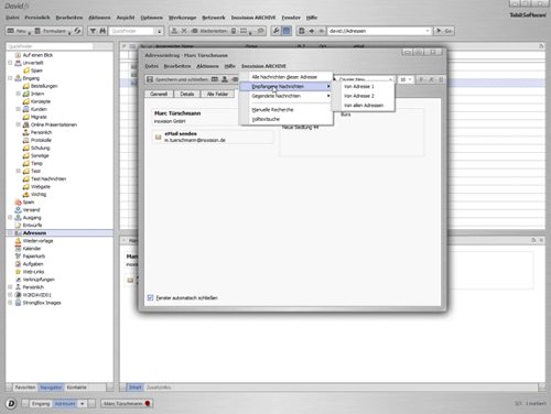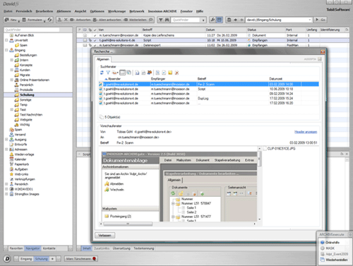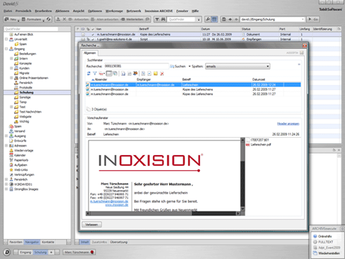 Das inoxision ARCHIVE-Plug-in für Tobit David® bietet einen direkten Zugriff auf Archivfunktionen direkt aus dem Mail-Client. Sowohl die Recherche inkl. Volltextsuche als auch die Ablage von E-Mails sind direkt in die Oberfläche integriert. Intelligente Rechercheszenarien ermöglichen einen schnellen Überblick über den Mailverkehr und sind nach verschiedensten Kriterien selektierbar. Durch die Nutzung der Tobit David® Scripts ist die Integration durch den Fachhandelspartner für kundenspezifische Anforderungen flexibel anpassbar. (Um die Tobit David®-Integration nutzen zu können, wird das Modul "Integrationsclient" benötigt.)