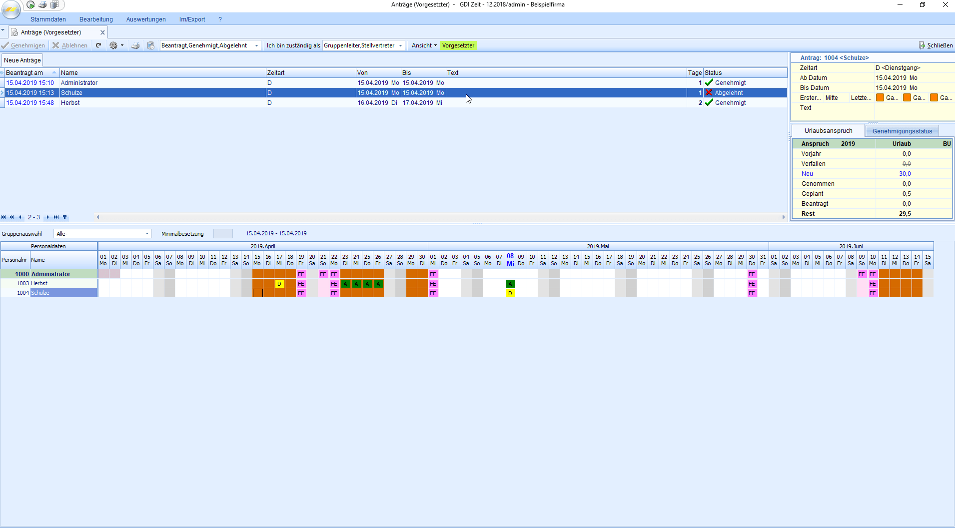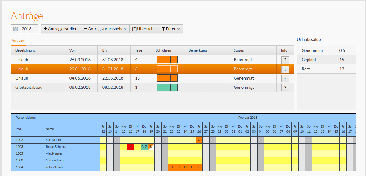 Die Antragsverwaltung dient dazu, dass Mitarbeiter selbständig Anträge für Fehlzeiten wie Urlaub, Gleitzeitabbau, Fortbildung usw. stellen können.
