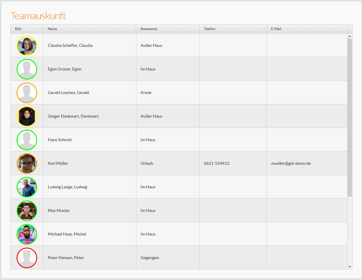 - Flexible Sortierung nach Name, Anwesend, Telefon oder E-Mail