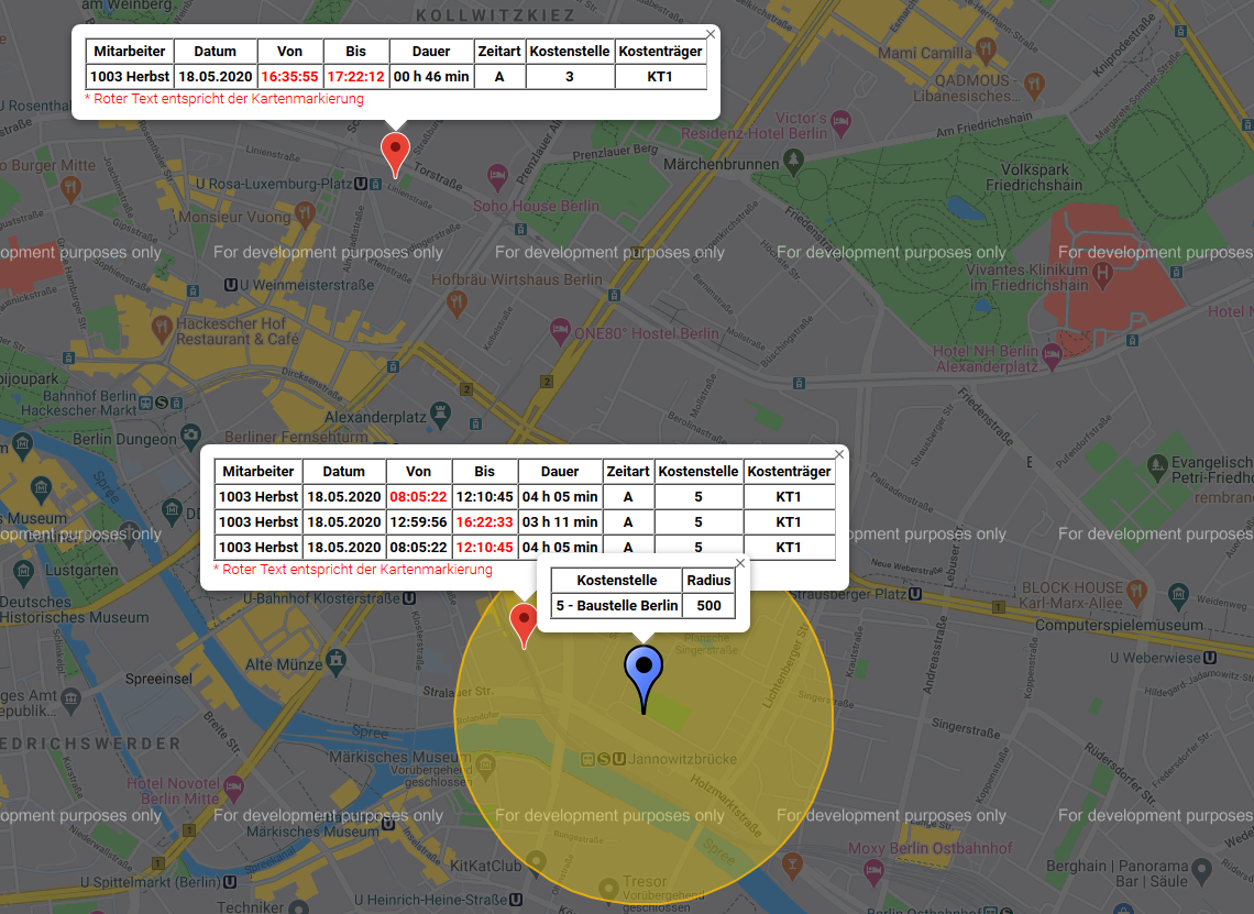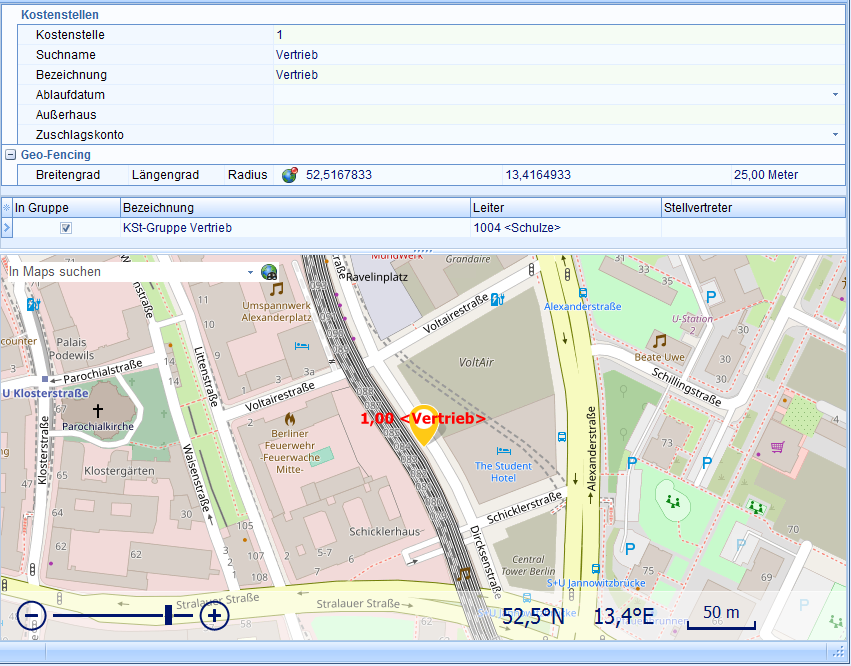 Einfache Erfassung der Geofences innerhalb der zuzuweisenden Kostenstelle per Eingabe von Koordinaten und Radius oder durch Auswahl des Standortes auf der Karte.