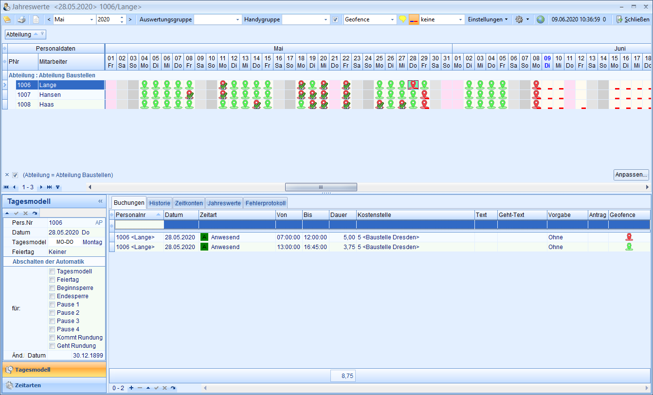 Innerhalb der Jahreswerte – der zentralen Verarbeitungsmaske der Zeiterfassung – werden die Buchungen inklusive Geodaten zur Überprüfung angezeigt.