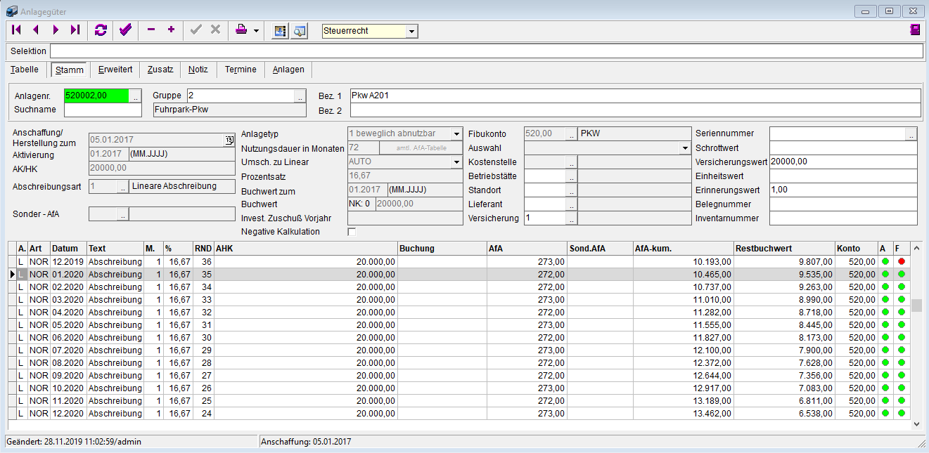- Automatischer Stopp der AfA-Errechnung bei Erreichen des Schrott- oder Anhaltewertes